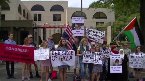 On the 11th of August, Code Pink and other opponents of Israel's invasion and siege of Gaza showed up in front of the Israeli Embassy, opposed by exactly ONE counterprotester. An Egyptian delegation opposed to the coup regime there showed up in solidarity. Since the coup regime in Egypt assists Israel in mantaining the ongoing siege of Gaza this was entirely appropriate.