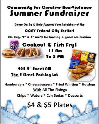 CCNV Summer Fundraiser: Supporting Our Homeless Neighbors Everyone is welcome to come out for the CCNV Summer Cookout & Fish Fry Fundraiser. All proceeds will go toward the upkeep of the building and to benefit the nearly 1000 homeless DC residents who reside there. We will have freshy fried whiting fish, flavored to perfection, hamburgers or cheeseburgers, all beef hot dogs, and all the trimmings. Ice cold bottles of water and your favorite chips and sodas on the side. Deserts will include freshly baked cakes, cookies, and the best southern bread pudding this side of the Mississippi! $4 & $5 plates. Bring a friend on your lunch break or when you get off. Spread the word!Event Location: 425 2nd Street NW, Washington DC, 20001. Event Dates: 08/02/2019 & 08 03/2019. Event Time: 11 am - 5 pm. We thank you in advance for your love, kindness, and support! This is a family friendly event. If you are unable to attend, please free to donate to the Community for Creative Non-Violence. We accept non-perishable and canned foods, gently worn clothing, toiletries, other domestic home items, and monetary donations. We are a 503c non-profit and all donations are tax deductible.