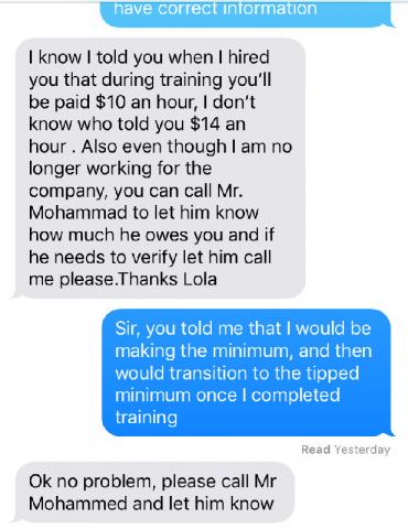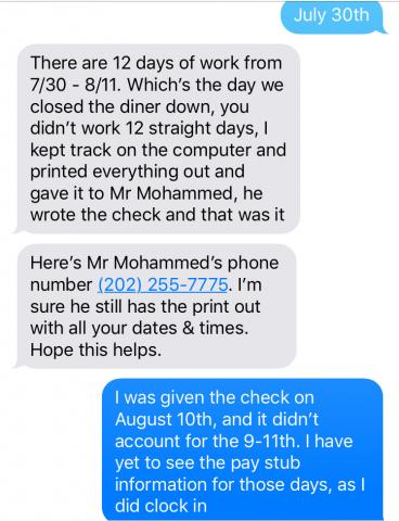 The (cropped) messaging screenshots below tell the story of one of many employees who pay has been shorted by Mono Diner's owner, probably not even the worst case. The "No problem, please call Mr Mohommed" part was where efforts to collect unpaid wages stalled, as he is the one responsible for the choice to steal and pocket wages owned to his workers. Everyone else in the chain of responsibility did what they could, but the boss has been flat-out refusing to pay.