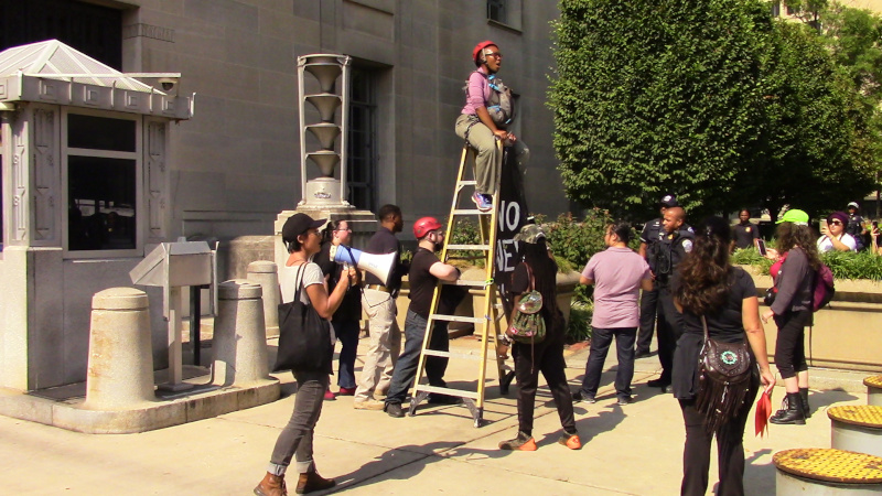 On the 1st of October, protesters from the DC Abolition Coalition (prison abolition) locked themselves to ladders blocking all the vehicle driveways into or out of the Dept of Justice. Police used power tools recklessly and shook ladders while cutting them out of the 9th st side of the lockdown. They also threatened to knock out an African-American woman on top of one of the ladders.