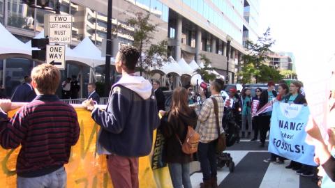 The climate protest began with a rally at Murrow Park, opened by a speaker from the Piscataway Nation on whose stolen land the IMF and World Bank sit. During the rally, one speaker from a group which has met with the World Bank over fossil fuel funding reported the "gasped" when asked to entirely stop funding coal, oil, and gas projects.