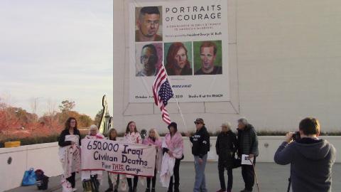 On Veteran's Day (Nov 11), Code Pink protested at the Kennedy Center against an exhibit "artwashing" the Iraq War. The Boeing-sponsored exhibit is of GW Bush's own paintings of the very veterans whom he sent to war and who came back wounded. Bush sent them to fight for lies about nonexistant WMD and nonexistant Saddam-al Quaeda ties.