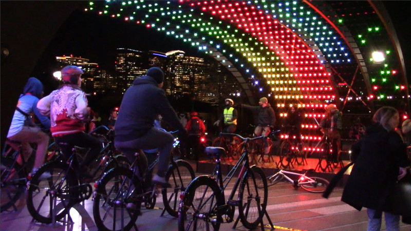 On the 11th of December, the last DC Bike Party of the year took to the streets. After an uphill run via Mass Ave and some side streets to Wisconsin Ave, the ride stopped at "Light Battle" at Georgetown Glow. This artwork features two teams of stationary bikes and an arch of pulsing LED lights.