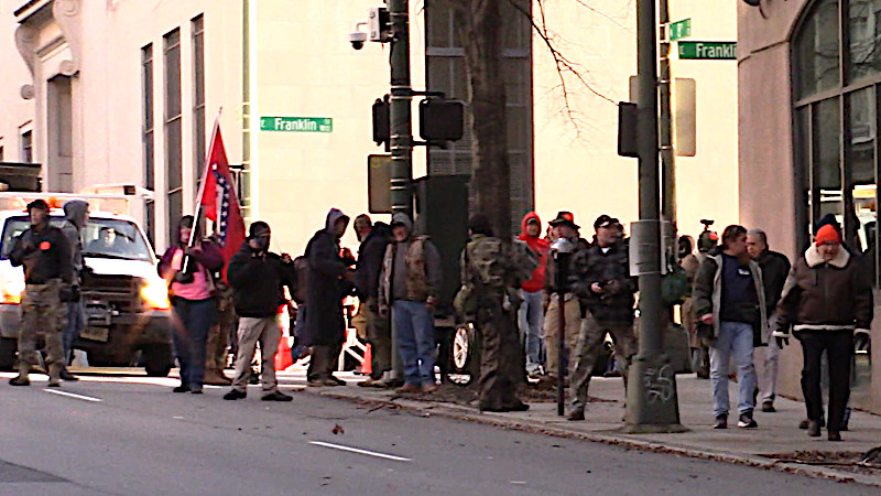 While there were a lot of Trump supporters in MAGA hats etc there, every time they tried to get pro-Trump chants going the far larger overall crowd refused to chant with them. Trumpers were common enough to give the rally the appearance of a Trump campaign rally, but the behavior of rallygoers said otherwise. The Trumpers were the most numerous right-wing "other than guns" people present, but nastier and more violent folks were also on the scene. One group of militiamen made threats against an Indymedia reporter, describing him and using the words "black bike" over their radio communications network. This particular cluster was on foot and were unable to deliver (short of opening fire) on their threats against a much more mobile bicycle-riding camera person.