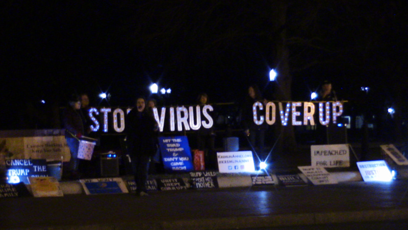On the 5th of March, the Kremlin Annex protesters were out again, this time with their lighted letters condemning Trump for minimizing the covid-19 coronavirus mess. Due to the Park Service's recent demands for a PAID sound permit, they were again on the H St sidewalk.