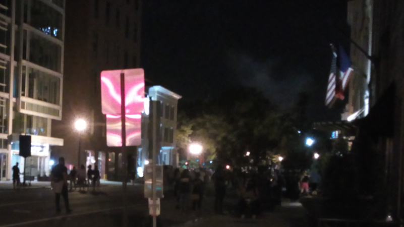 There are reports of protest "gassed away" from Lafayette by police (followed immediately by a reported looting of a T-Mobile store), but normally only pepper spray and not gas is used in DC. Protesters remained in or returned to that area at least until 1AM, though there were many stampedes early on caused by the first few flashbangs or fireworks to be detonated. As more explosions sounded the stampedes dies out, people becomeing used to the sound of the blasts as they would on July 4th. Not confirmed whether police bothered to "spice up" the already acrid mix of plastic smoke and firefighting chemicals with actual tear gas, though the smoke did tend to sting the eyes. Masks worn for COVID-19 protection reduced the effect of the smoke on lungs though a nunber of people were observed coughing from the smoke.
