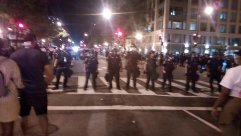 Use of rubber bullets and/or pepperballs by police is CONFIRMED, as is the use of flashbangs by police, fireworks by their opponents, or both. Some of the explosions of these could be heard for many blocks as the smoke and din of battle rose over H St and Lafayette Square. Trump did NOT get his "MAGA Night" in the end. First of all, Secret Service would have had to open at least one gate in a siege, which normally means losing that gate or fence position. Second, it would have been suicidal for fascists to attempt to reach Lafayette Square in the middle of a pitched battle between over 1,000 anti-racist fighters and huge numbers of riot cops, Secret Service, National Guard, and Military Police.