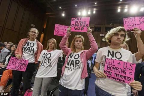 On the 18th of September,the UK Daily mail released an article potentially conflating the recent Code Pink protests on Capitol Hill with the "Flames of War" propaganda video recently released by the so-called "Islamic State." The article as a whole is mostly about the video, if read with most JavaScript turned off the photos appear in a slideshow, mostly still from the video, plus one scene of cops in Times Square and once scene of Code Pink getting into a war hearing "without a challenge from Capitol Police." A careful reading of the story with all JavaScript except trackers turned on reveals two other videos: one of US General Dempsey saying US ground troops cannot be ruled out, and one of Code Pink disrupting the hearings. A quick scan, however, gives the false impression that Code Pink's protest actually appears in the Islamic State video! Only a full reading reveals that the article leaves the subject of the video and describes other war news, including the Code Pink protests, near the bottom.
