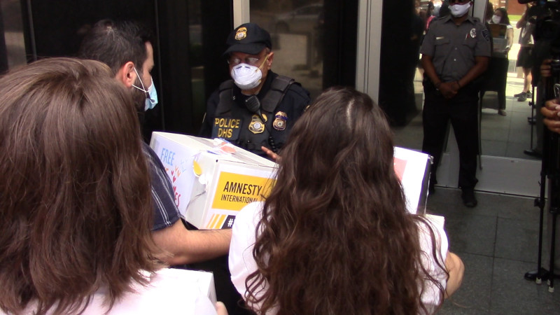Security guards refused to allow the signed petitions in the door, claiming nobody was there.