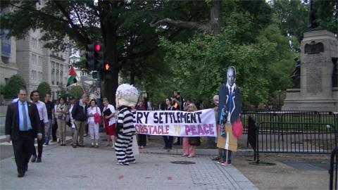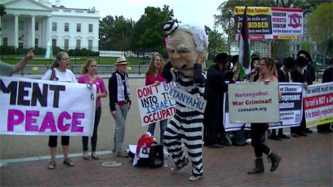The center of the park was originally open to the public, as is usual during state visits even from hated figures like Netanyahu. This time around, Secret Service decided while the protest was taking place to clear everyone but themselves (and one presumed undercover) from the park. Surely they would have cited the recent security scandals if asked, but Code Pink activists said they were certain this was instead in response to a direct request from Netanyahu to "get rid of them." Oh well-at least they didn't break Medea Benjamin's arm like Israel's allies in the Egyptian coup government did, nor saturate the park with a mixture of tear gas and "bad smell water" plus rubber bullets like Netanyahu's own police do every Friday to protesters in the Occupied West Bank.