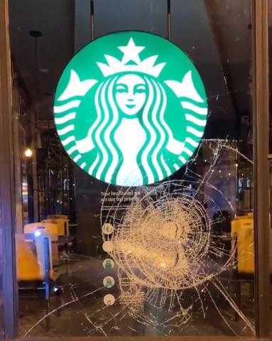 There are unconfirmed reports of tables turned over and a broken window in Adams-Morgan, though the author of this story never heard the sound of a heavy safety glass window being smashed. Baseball bats or hammers breaking this kind of glass often sound like a bar throwing out all their beer bottles at the end of the night, no such sound was audible from the front bike bloc. In all fairness the whole march was extremely loud overall. It is confirmed that the restaurant where an upscale patron SPIT on a protester in the middle of the COVID pandemic is in that row of restaurants however. Much later, the Starbucks in Dupont Circle received a broken window, this confirmed by video posted to Twitter and showing only the window and no protesters.