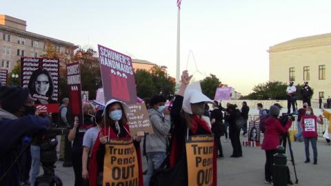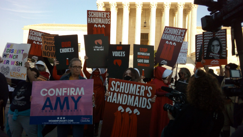 On the evening of October 26, GOP Senators rammed through the final confirmation vote to install Amy Coney Barrett on the Supreme Court 52-48, a party line vote. As they did so, women's rights activists protested while supporters of Christian theocratic fundamentalism celebrated.