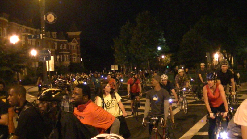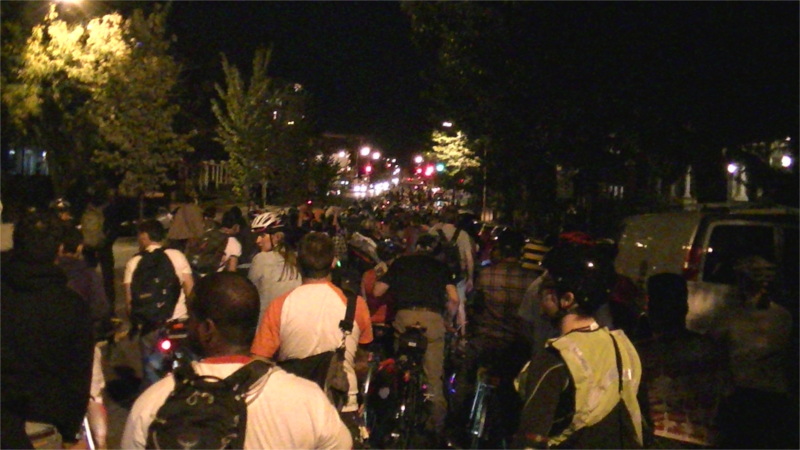 On the 8th of October, the usual several hundred riders (600+ is average) took to the streets of DC for the monthly bike party. A just past full moon was in the sky as the streets swarmed with cyclists, some in a Halloween theme.