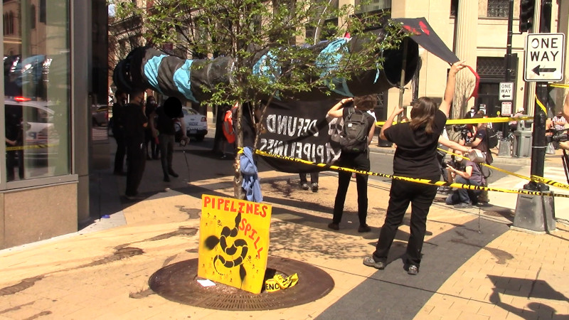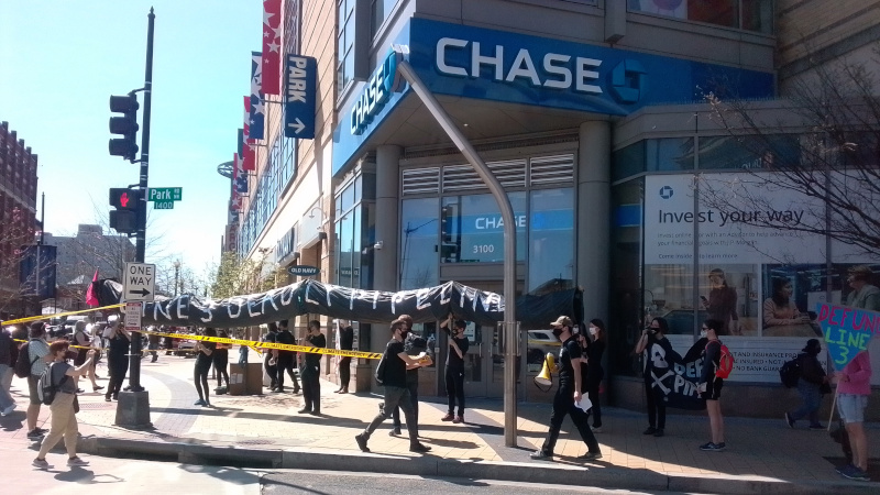 On the 27th of March, Extinction Rebellion-DC first took a mock pipeline/Black Snake into Chase Bank, then dumped mock "oil" on the sidewalk outside the bank.Chase Bank, like Citibank and Bank of America (also called out on March 27) is a major funder of Enbridge, builder of the "Line 3 replacement" pipeline threatening to destroy Chippewa land in Minnesota.