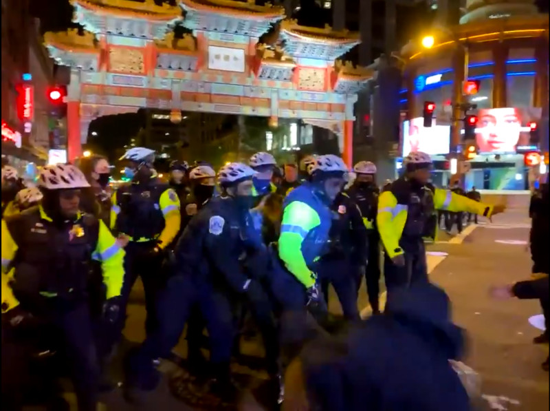 Afterwards, as the march dispersed under the Chinatown arch, bike cops suddenly attacked people who were still there, ultimately managing to arrest three on unknown (as of 2AM on Sun, April 18th) charges. This sort of aggression is no surprise from racist bullies, and waiting to strike until dispersal also implies they were afraid to fight the full crowd in its deployed formation. Such an attack would have run into a wall of shields and bikes.