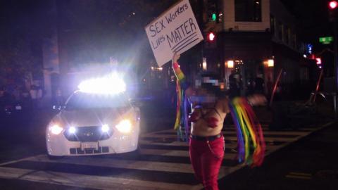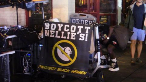 Continuing rain after thunderstorms did NOT stop boycott Nellie's protesters from descending on 9th and U st. Protests over Keisha being dragged down the stairs on Pride weekend are going into their 3ed month.