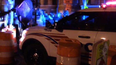 Video-marchers use traffic barrels to keep cops at bay 1 min 18 sec