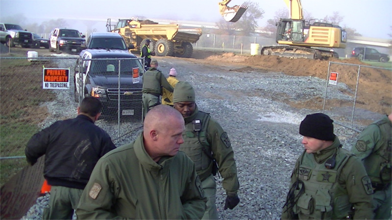 Today’s protest followed two previous major actions at the same site, both within the last week. On Monday, November 3, Kelly Canavan, president of AMP Creeks Council and an organizer with Stopping Extraction and Exports Destruction, locked herself to a piece of construction equipment at the same site, delaying the start of the work day. She was extracted by members of the Calvert County Sheriff’s Department, arrested, and detained for several hours. On Tuesday, nine activists entered the site to demonstrate opposition as part of the Beyond Extreme Energy week of action. They were arrested, along with two photographers, and detained overnight.