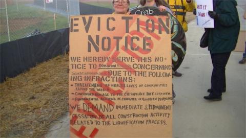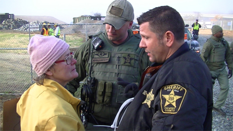On the 10th of November, opponents of exporting fracked gas out of Cove Point, MD returned to Dominion's pier construction site in nearby Solomons, MD site for the 3ed time in 8 days. Protesters arrived at 6AM and confronted trucks entering the site. Near the end of the protest, Leslie Garcia from Lusby, MD was arrested for attempting to deliver an eviction notice to the site. Lusby is immediately south of Cove Point and caualties there are expected if there is a serious accident with the proposed LNG export plant.