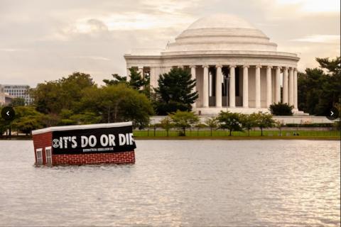 Early AM on Sep 22, Extinction Rebellion DC sank a mock house in the Tidal Basin to dramatize the effects of rising sea levels. Park Police arrested their swimmer who allegedly guided the house for "operating a vessel without a permit. That house is not a boat, but boats will soon be needed by DC residents if climate chaos keeps pushing up sea levels