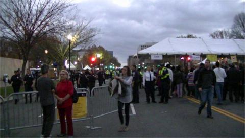 At the time of this massive response by cops on foot and on bike, the checkpoint stopped admitting people and a huge backed-up line formed as a result. There were remarks from some in Code Pink comparing this to the chaos of the first Obama inauguration, which reminded me of the infamous "purple ticket" scandal of spectators left to wait in a tunnel for hours, then not admitted.