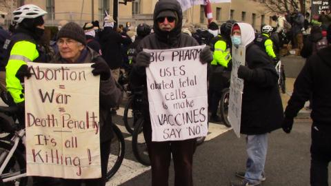 Also present in the "mainstream" antichoice march were anti-vaccine activists. One of them had a sign demanding people refuse the vaccine over allegations of cell lines dating back to abortions decades ago being used in developing (NOT manufactoring!) one or more of the vaccines. Masks were as rare as vaccinations: the only masks the author of this story saw were on Patriot Front and on counterprotesters. The so-called "March for Life" stated on their website that masks were required in the march, but this appears to have been for prior media consumption only. As predicted, this event has some serious superspreader potential.