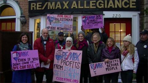 On the 3ed of December, Code Pink showed up at the Capitol Hill office of Remax, demanding they stop selling settlement homes on stolen land in the Palestinian West Bank. ReMax's Israeli subsidiary is trafficking in homes build on stolen land as part of the illegal settlements. Therefore, ReMax has become a target of the BDS (Boycott Divestment Sanctions) movement.