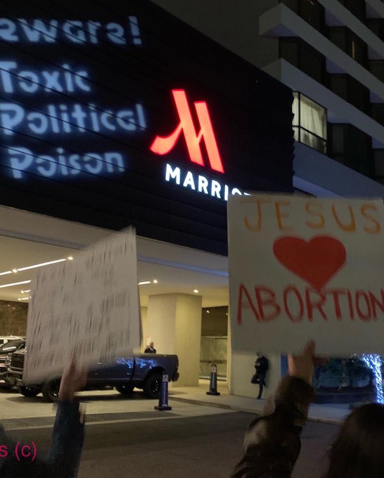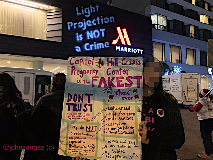 On Dec 1, a banquet for the so-called "Capitol Hill Crisis Pregnancy Center" was held at a Marriot in Crystal City. Protesters showed up outside chanting and banging drums. In addition, a projector was used to show messages on the side of the building. On top of all else, three protesters got inside and shouted down the proceedings. One person screamed "Jane Says Revenge, motherfuckers! Blood on your hands!