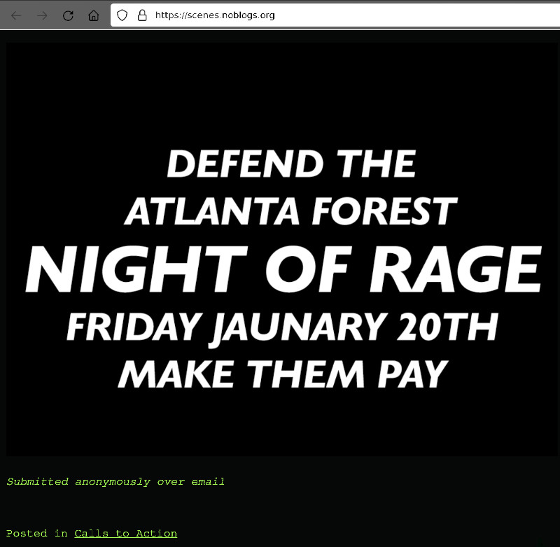 The worst has come to pass. An unnamed forest defender has been shot and killed in Weelaunee. Consider this a call for reciprocal violence to be done to the police and their allies. On Friday, January 20th, wherever you are, you are invited to participate in a night of rage in order to honor the memory of our fallen comrade.Love and rage Defend the Atlanta Forest