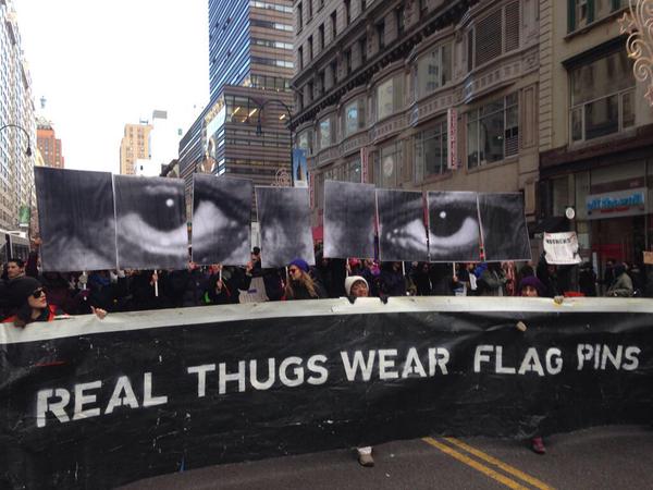 Another march in New York City was also reported to draw about 50,000 people. A banner in that march read "real thugs wear flag pins." There was also a very ugly incident in Berkley, CA where racists disliking the protests put an "I can't breathe" T-shirt on a dummy and hung it from what appears to be an ornamental gate. This incident goes to show that KKK style racism is still alive and well outside as well as inside police departments. In Ferguson Anonymous has charged that a "ghoul squad" of KKK members has infiltrated the St Louis Police Department. In light of this ugly reality one sign at the Justice For All March asked for UN intervention against killer cops in the US.