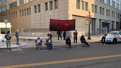 Cops managed to force the elders in rocking chairs blocking FERC's driveway to move, only to effectively do their job for them by blocking the driveway themselves afterwards.