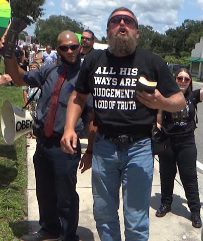 Defenders held the property line, forcing the police to keep the attackers at bay on the sidewalk. One was using a bullhorn, unlike others using bullhorns at protests in Lakeland he was NOT arrested, only ordered to shut it up.