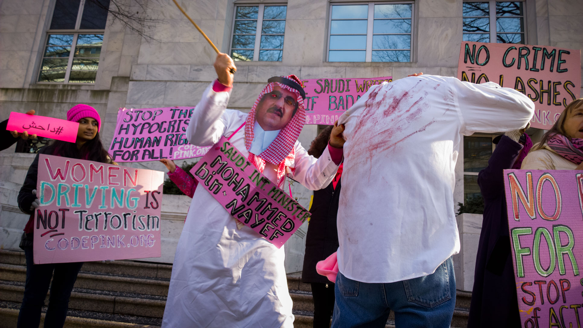Code Pink joined Saudi human rights activist Ali Al-Ahmed of the Gulf Institute in front of the Saudi Arabian embassy in Washington DC to protest the US's continued support for the regime despite continuing egregious human rights abuses, including the ongoing flogging of Saudi blogger Raid Badawi for questioning the role of religion in supporting the Saudi regime.