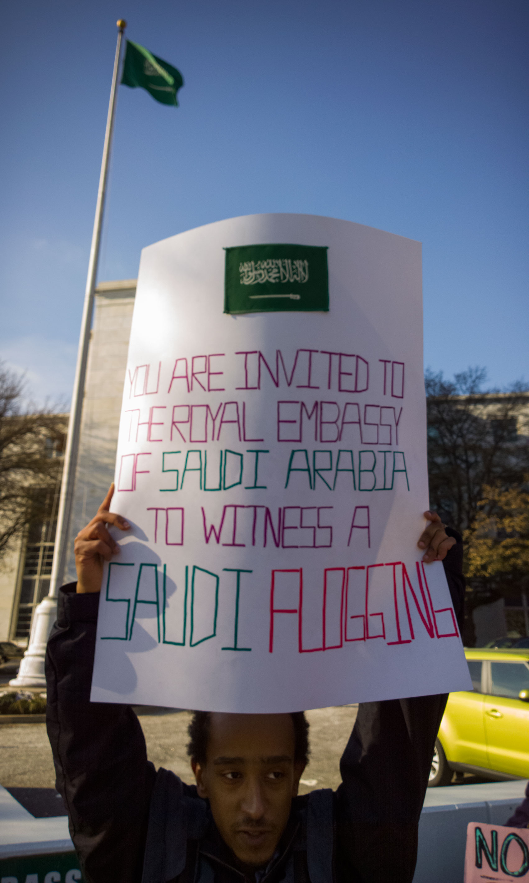 The activists performed a mock flogging at various entrances of Saudi embassy, getting the attention of visitors to the embassy as well as diplomatic security officers.