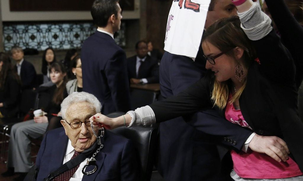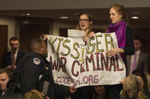 Henry Kissinger is a notorious war criminal who must watch where he travels because of arrest warrants abroad. On the 29th of January, he found that citizen's arrest is also a danger. He showed up to speak before the Senate Armed Services Committee, only to find Code Pink was waiting for him. Considerable disruption ensued as the banners came up and Code Pink attempted to serve those international warrants via a citizen's arrest.
