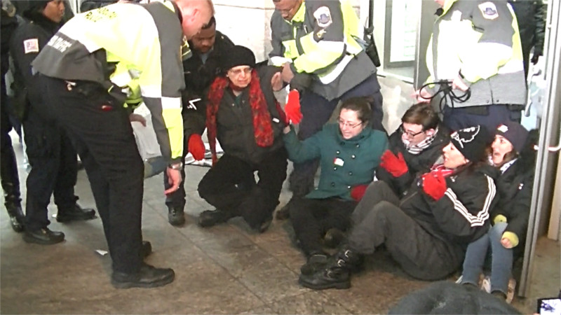 On the 1st of March, several protesters were arrested while blocking a door of the Washington Convention Center during the start of the convention of AIPAC, the "American Israel Public Affairs Committee." At first conventiongoers bypassed the blockade by other doors, leading to a determined attempt tp get into the building. Some protesters managed to sneak in while others tried to re-establish the door blockade on the inside of the doors. They were dragged outside by cops, who the conceded the top of the steps to protesters. Finally several protesters were arrested while blocking a door open so the sounds of the protest could be heard more clearly from inside.
