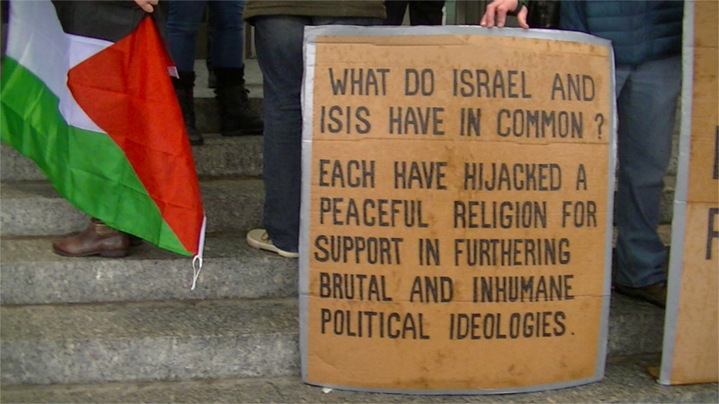 One of the speakers at the rally on the Convention Center steps reminded everyone that Israeli settlers burned a Palestinian teenager to death in the runup to the Summer 2014 Gaza War. The implicit comparison to Daesh (ISIS) did not have to be spoken directly to be understood by everyone: Israeli settlers and Daesh are the only two groups in the whole Middle East currently known to include burning people alive in their playbook.In addition to the teenager burned alive by settlers, Israel has used incendiary white phosphorous bombs on occupied homeds in their recent wars with Palestine. Another comparion to Daesh was made by a protester whose sign bluntly said that ISIS and Israel both hijack religion for political purposes.