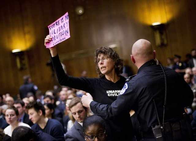On the 11th of March, Code Pink confronted US Secretary of State John Kerry as he spoke before Congress to support US military intervention both against ISIS and in the Ukraine. Two members of Code Pink were arrested. One point Code Pink was making is that US intervention created ISIS/Daesh, so it stands to reason that more US intervention will produce more terrorism.