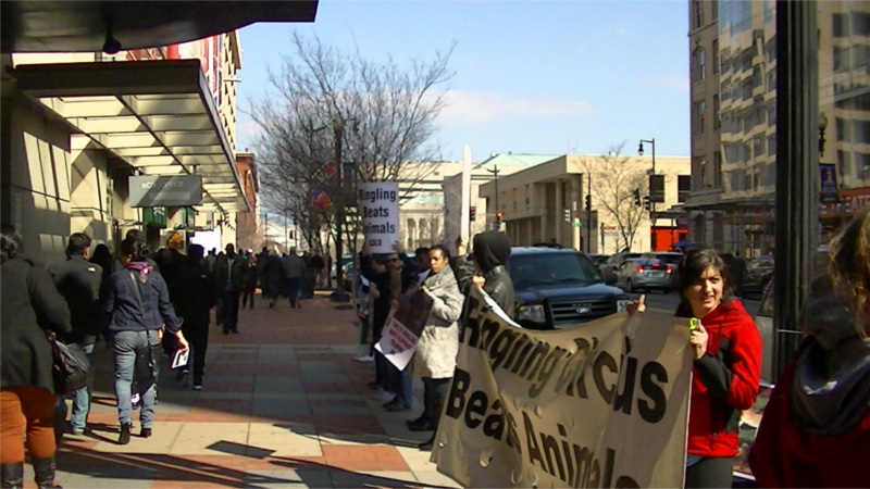 On the 20th of March, animal rights protesters showed up for the second night in a row outside a DC performance of Ringling Brothers and Barnum Bailey circus. On the 21st of March even more protesters were present throughout the daytime performance of the circus One of the protesters on March 20th was a former elephant trainer displaying a real bullhook, the instrument used to beat the elephants into submission. Ringlings has announced they will retire the elepant acts, but not all the other animals such as tigers