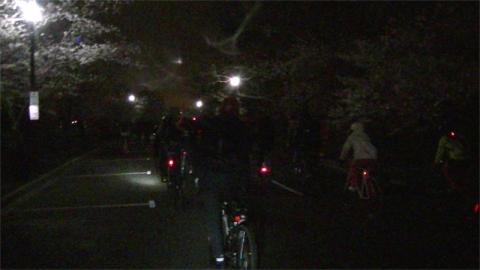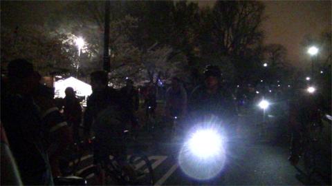 On the 8th of April, hundreds of DC area cyclists gathered in spotty rain for the first of the year's DC Bike Parties. They leave Dupont Circle at 8PM on the second Wednesday of each of the warmer months of the year. This one was the Cherry Blossom Chase, and rode to the Hained Point loop, under newly opened cherry blossoms. Just before the ride began the rain tapered off to nothing more than drizzle, nowhere near enough to dampen the spirits of hundreds of riders on the first Bike Party of the year