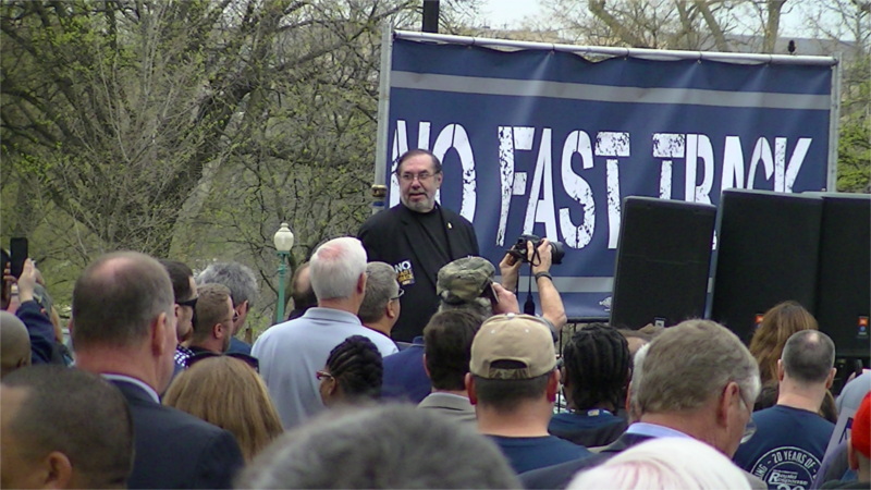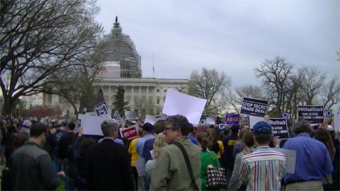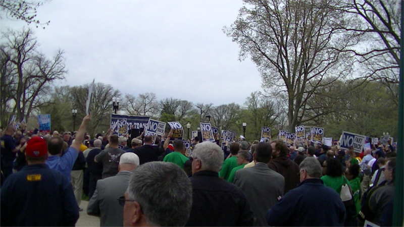 On the 15th of April, large numbers of union supporters gathered on Capitol Hill oppose the proposed TPP or Trans-Pacific Partnership. They called this "another NAFTA," and even used the term "SHAFTA" for the trade deals that have been offshoring US jobs and led to plummeting wages since 1994. Multiple members of Congress as well as union officials had some unusually tough talk against the "fast track" bill for the TPP. Fast track means a quick ratification vote with no debate if a treaty is signed, for a treaty whose very text is being kept secret.