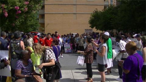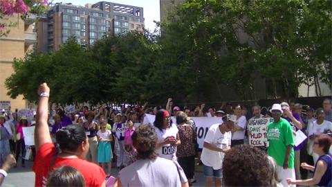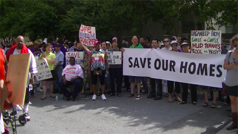 The residents of Museum Square, one of the last Section 8 rentals in Chinatown are facing mass eviction followed by demolition and condo construction. Bush Companies (of Williamsburg, Va.), the landlord, offers only an option to buy the building for nearly ten times what the DC government assessed it as being worth for property taxes. On the 23ed of June, the tenants staged a mass protest against the planned evictions. They were backed by the National Alliance of HUD Tenants.