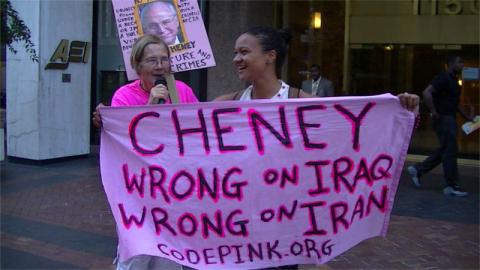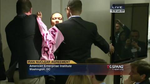 One of Cheney's fans inside AEI became rather violent in a failed attempt to steal the banner from the activist who got inside. That whole scene was rather rough. It should be remembered that AEI was the author of "project for a New American Century" back in the late 1990's. This proposal called for aggressive US foreign policy-and postulated that "another Pearl Harbor" would be needed to bring it about. Interesting remarks considering they got their wish after Sep 11, 2001. Only thing is, the Iraq War didn't go as they planned. Now the "export of democracy and markets" idea is in ruins while millions flee Syria and religious extremists chop off heads.   AEI and Cheney were wrong on Iraq, so it stands to reason they should be presumed wrong on Iran too.,