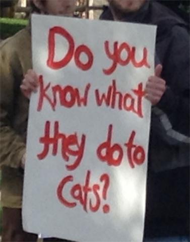 DC-area activists weren't surprised to meet grumpy neighbors when we went to the home of Stephen Skinner, Executive VP and General Manager of Skanska’s DC office. These folks have met No New Animal Lab protests before with angry chants and phone calls to the cops. Saturday morning, we were immediately confronted by a man we've met before, filming from his van and asking where we are from and what we were doing in the neighborhood. We ignored him as he made phone calls and we marched directly into Skinner's cul-de-sac. Skinner himself came outside, but only long enough to put his usual Skanska "No Trespassing" sign in the yard. Even inside, he certainly heard us call him out for his company's role in building the UW's new animal lab and helping that university condemn thousands more animals to captivity, torment, and death underground. Other neighbors quickly assembled, with one man aggressively putting his video camera in our faces as we chanted. Another used his own chalk to scribble over our messages to Skinner on the street. Other neighbors stood just back on the sidewalk and heckled. Sad to say this community is more interested in organizing to protect a corporate executive than cats and dogs. Our group, however, kept our cool and didn't engage with the neighbors. With every action, we are building our own skills as organizers, growing in numbers, and strengthening our ties to one another and to the larger grassroots movement for animal liberation -- until ALL the labs are shut down!