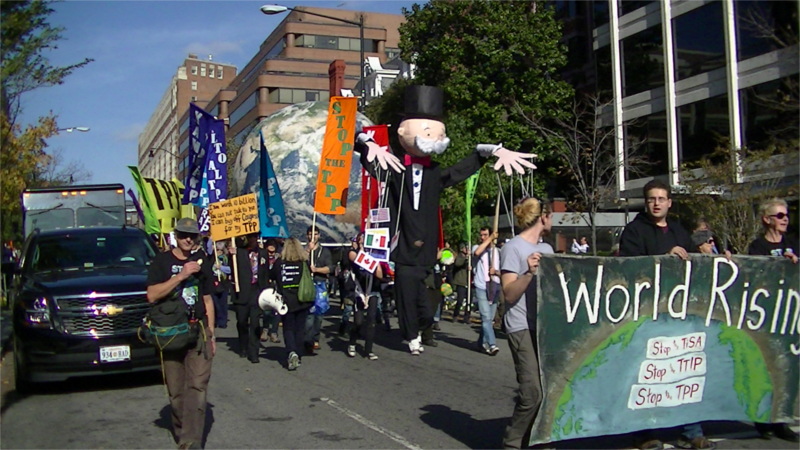 On the 17th of November,protesters against the TPP trade deal marched to the embassies of many countries affected by the treaty.At the Embassy of the Phillipines, protesters burned a symbolic "TPP text" much smaller than the 6,000 page stack in solidarity with protesters in the Phillipines who burned ASEAN logos. At the Embassy of Japan, one protester locked himself by the neck to the doors. It took about an hour for police to remove and arrest him.