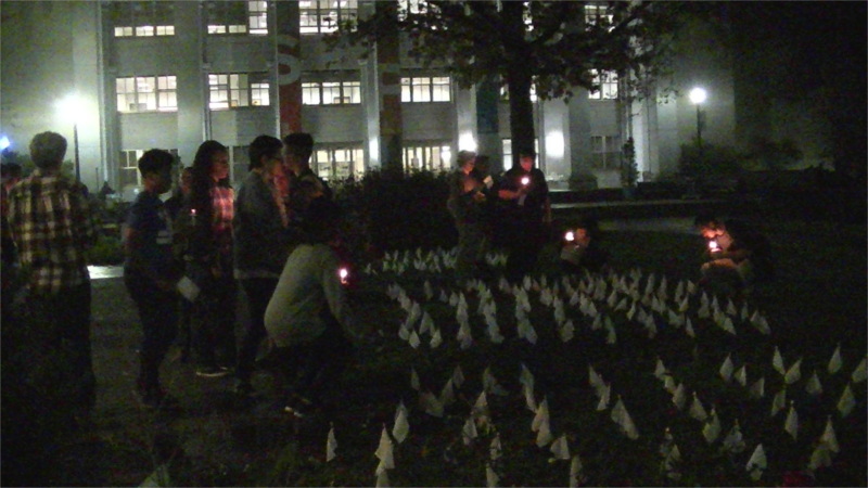 On the evening of November 19th the Queers and Allies' Trans and Non-Binary Collective at American University held the Trans Day of Remembrance Vigil and Speakout. After speakers at the indoor portion spoke of the severe discrimination, poverty, and widespread murder and police violence faced by transgender people, everyone went outside for a vigil to remember those who have been killed. Flags of remembrance for the fallen were planted in the quad while the whole group held candles in the dark.