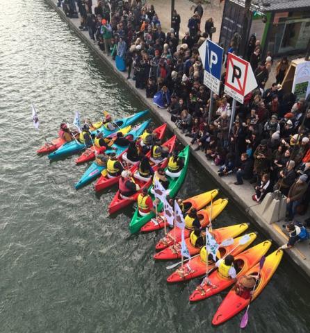Two days later: an Indigenous flotilla in kayaks . This photo appeared in both Lacy,s and Adam Eidinger's Twitter feeds.