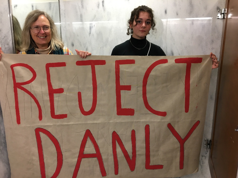 Three members of Beyond Extreme Energy (BXE) disrupted the Senate Energy and Natural Resources Committee hearing for James Danly, who was nominated by President Trump to be the third Republican commissioner at FERC, the Federal Energy Regulatory Commission. Two BXE members unfurled a banner reading “Reject Danly” and yelled "FERC: No more fossil lovers! Wind and solar now!" before being removed from the room and arrested.
