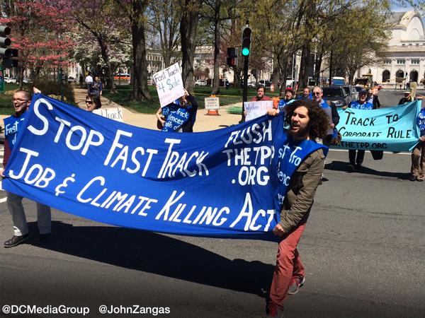 On the 15th of April, large numbers of union supporters gathered on Capitol Hill oppose the proposed TPP or Trans-Pacific Partnership. They called this "another NAFTA," and even used the term "SHAFTA" for the trade deals that have been offshoring US jobs and led to plummeting wages since 1994. Multiple members of Congress as well as union officials had some unusually tough talk against the "fast track" bill for the TPP. Fast track means a quick ratification vote with no debate if a treaty is signed, for a treaty whose very text is being kept secret.