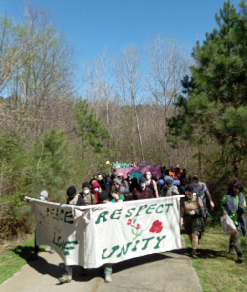 On the 28th of March, Shut Down DC protested at the Dept of Justice, demanding a Federal investigation into Georgia's human rights abuses over the Cop City project in Weelaunee Forest. At this time eight attendees at the march 5 music festival there are still being held without bond over muddy shoes or legal support numbers written on their arms.